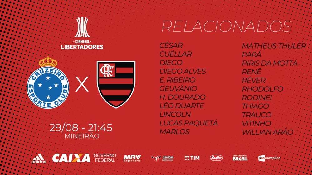 Flamengo ogłosiło listę piłkarzy powołanych na środowy rewanżowy mecz 1/8 fazy Copa Libertadores przeciwko Cruzeiro, który odbędzie się na stadionie Mineirão. Wśród powołanych zabrakło obrońcy Juana i napastnika Fernando Uribe, którzy zostali pominięci przez trenera Maurício Barbieriego.