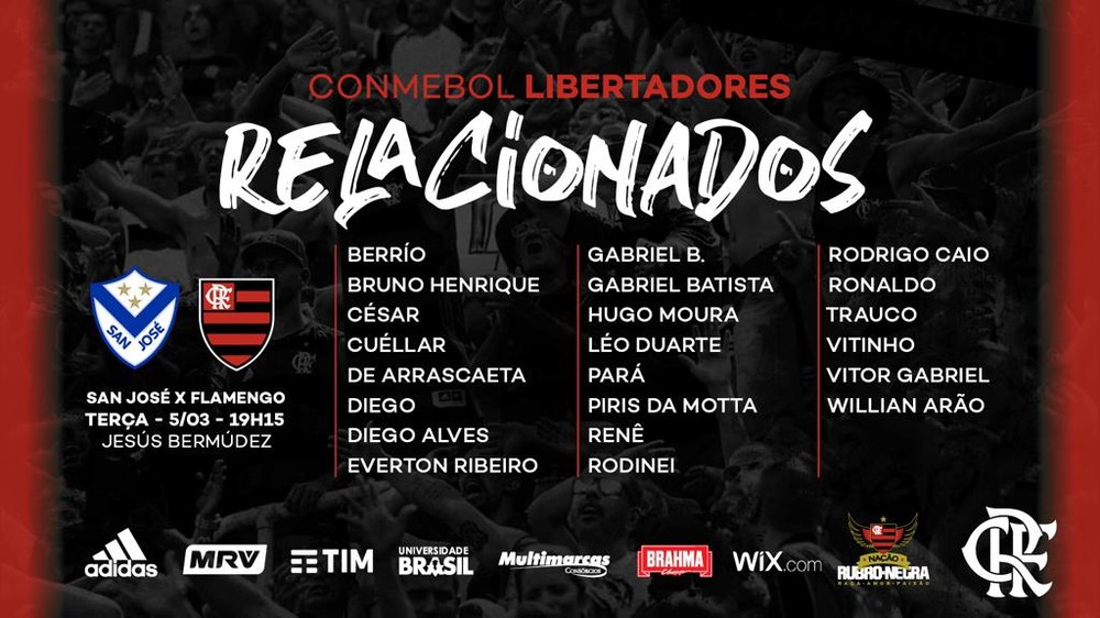 Podczas niedzielnej sesji treningowej, Abel Braga utrzymał skład, który wygrał w czwartek z Portuguesą. Oznacza to, że Rubro-Negro w spotkaniu z San José powinni wystąpić w następującym składzie: Diego Alves; Pará, Rodrigo Caio, Léo Duarte, Renê; Cuéllar, Willian Arão, Diego, Arrascaeta, Bruno Henrique, Gabriel.